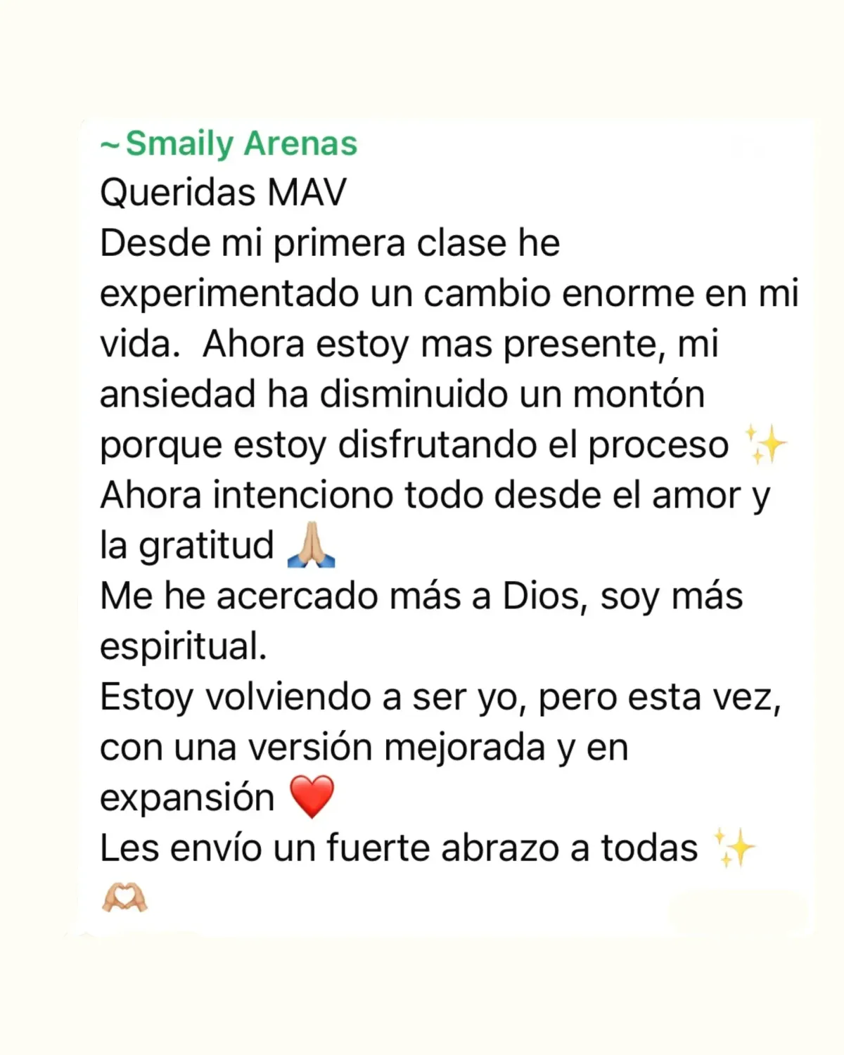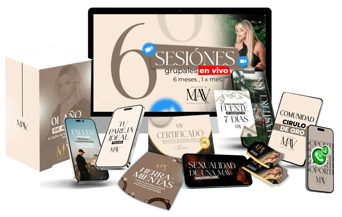 Acceso por 1 año a la Metodología MAV donde trabajaras e iras mejorando cada una de las áreas de tu vida. Cuerpo, dinero, mente, relaciones, profesión y espiritualidad.